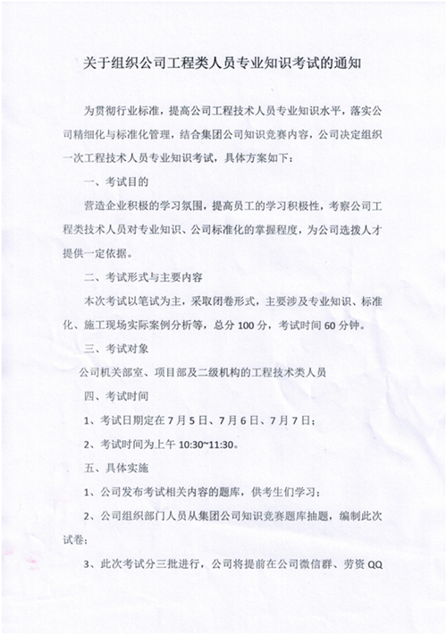 關于組織公司工程類人員專業(yè)知識考試的通知