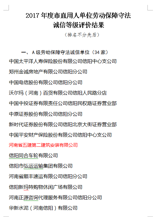近日,信陽市人力資源和社會保障局公布了《關(guān)于2017年度市直用人單位勞動保障守法誠信等級評價結(jié)果的公示》,我公司被評為A級勞動保障守法誠信企業(yè),這是公司連續(xù)多年獲評這一榮譽,也是信陽市唯一一家建筑施工企業(yè)獲此殊榮。