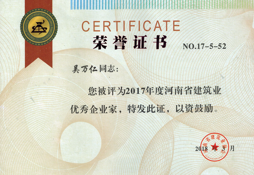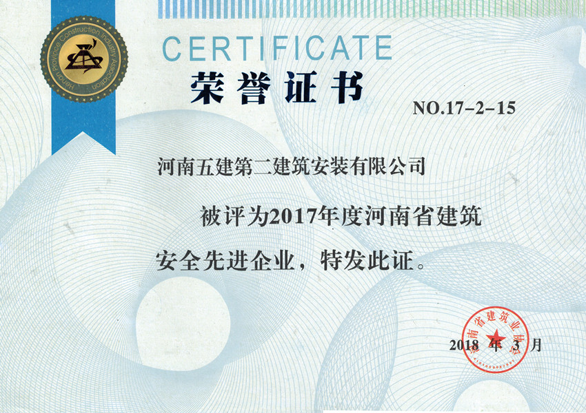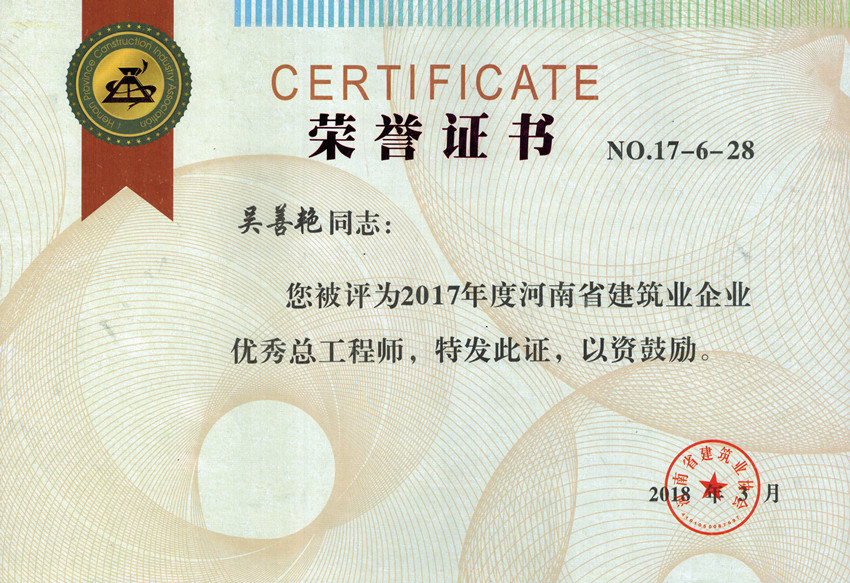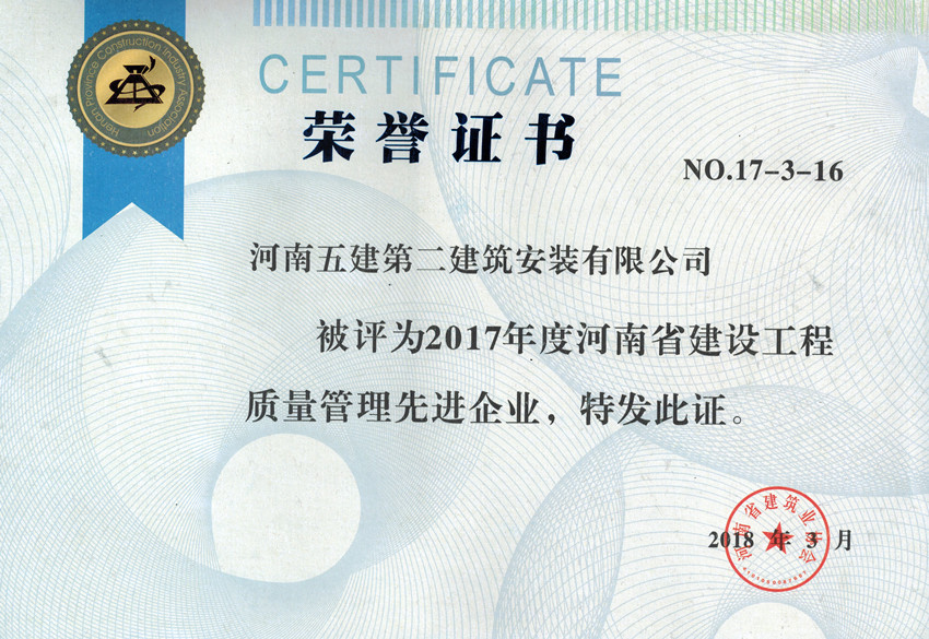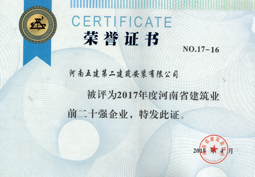 公司榮獲 2017年度“河南省建筑業(yè)前二十強企業(yè)”、“河南省建筑業(yè)先進企業(yè)”等多項榮譽