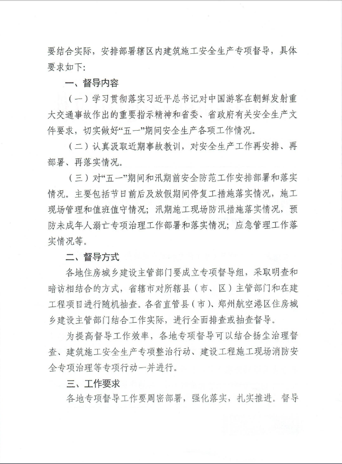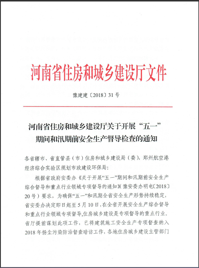 河南省住房和城鄉(xiāng)建設(shè)廳關(guān)于開(kāi)展“五一”期間和汛期前安全生產(chǎn)督導(dǎo)檢查的通知
