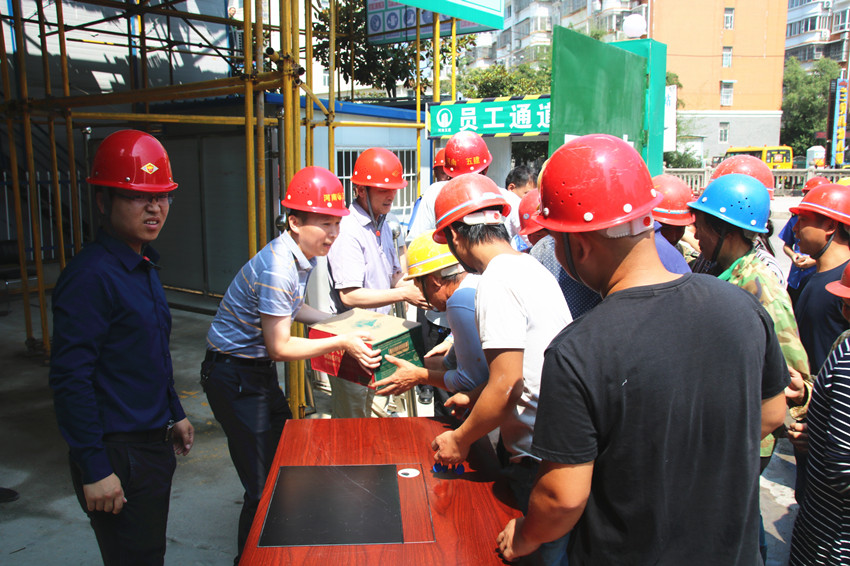 近期,連日高溫,驕陽似火,為保證施工進(jìn)度,奮戰(zhàn)在一線的項(xiàng)目職工戰(zhàn)高溫、斗酷暑,在滾滾熱浪中保質(zhì)保量、高效地完成著施工生產(chǎn)任務(wù)。為做好防暑降溫工作,保障一線員工的健康權(quán)益,信陽市住房和城鄉(xiāng)建設(shè)局副局長陳弋明攜市城建監(jiān)察支隊(duì)隊(duì)長蔡維全及城建監(jiān)察人員一行不畏酷暑,來到我公司湖東春天項(xiàng)目部,為奮戰(zhàn)在一線的廣大員工送去了絲絲涼意,還有端午佳節(jié)的親切問候。