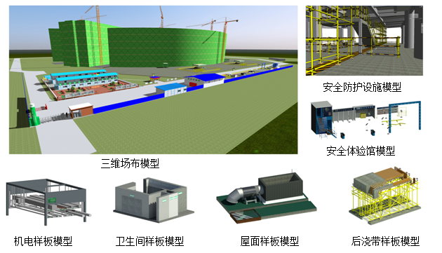 2、三維場布模型施工現(xiàn)場平面布置三維場布建模采用Revit軟件創(chuàng)建,分為:現(xiàn)場布置三維場布模型、后澆帶樣板模型、衛(wèi)生間樣板模型、屋面樣板模型、機(jī)電樣板模型、安全體驗(yàn)館樣板模型、安全防護(hù)設(shè)施模型(圖3)。