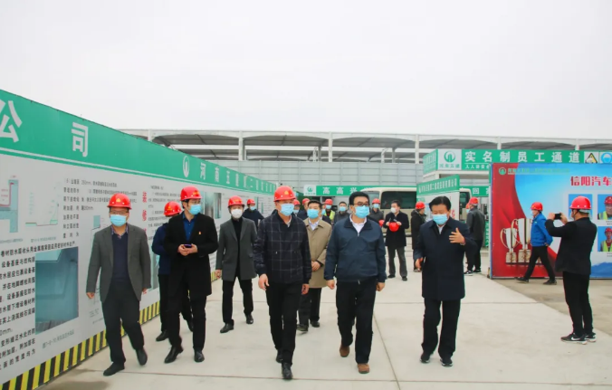 3月30日下午,公司在建項目信陽長途汽車東站及配套設(shè)施用房項目再次迎來尊貴的客人,河南省人民政府副省長何金平帶領(lǐng)省住建廳、商務(wù)廳等部門主要負(fù)責(zé)同志蒞臨項目現(xiàn)場調(diào)研疫情防控及復(fù)工復(fù)產(chǎn)情況;信陽市副市長李正軍、住建局局長張立英、商務(wù)局局長郭珂、市場監(jiān)督管理局局長孫云宏等領(lǐng)導(dǎo)陪同調(diào)研,高新區(qū)黨委書記、管委會主任熊開程、副主任陳偉、信運(yùn)集團(tuán)董事長阮中杰、公司黨委書記、董事長吳萬仁參加了調(diào)研活動。