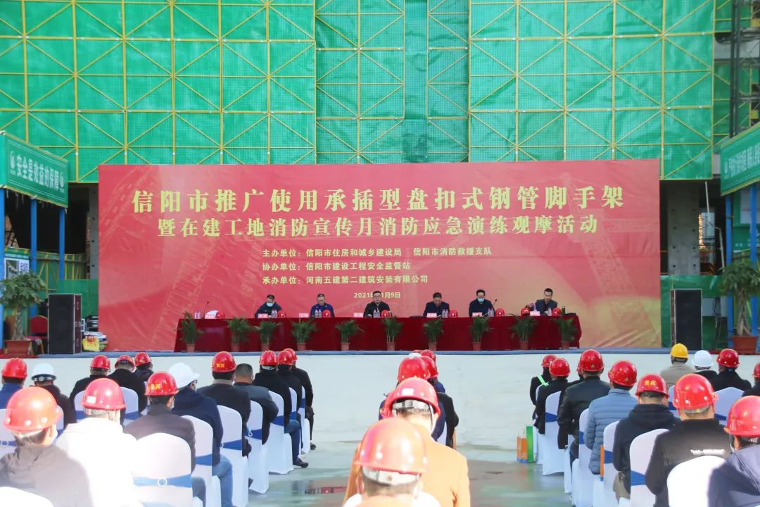11月9日,在第三十個(gè)全國(guó)消防安全宣傳教育日來(lái)臨之際,公司第七項(xiàng)目部承建的太古·湖畔樾山項(xiàng)目迎來(lái)尊貴的客人,信陽(yáng)市推廣使用承插型盤(pán)扣式鋼管腳手架現(xiàn)場(chǎng)觀摩會(huì)暨消防應(yīng)急演練活動(dòng)在項(xiàng)目現(xiàn)場(chǎng)隆重舉行。信陽(yáng)市住建局黨組副書(shū)記、副局長(zhǎng)張奔、安監(jiān)站站長(zhǎng)馬其峰、副站長(zhǎng)楊傳臣、信陽(yáng)市消防救援支隊(duì)副隊(duì)長(zhǎng)王偉等領(lǐng)導(dǎo)親臨活動(dòng)現(xiàn)場(chǎng),公司黨委書(shū)記、董事長(zhǎng)吳萬(wàn)仁受邀出席活動(dòng)并講話。整場(chǎng)活動(dòng)由會(huì)議階段、演練階段和觀摩階段三部分組成,由安監(jiān)站站長(zhǎng)馬其峰負(fù)責(zé)主持。