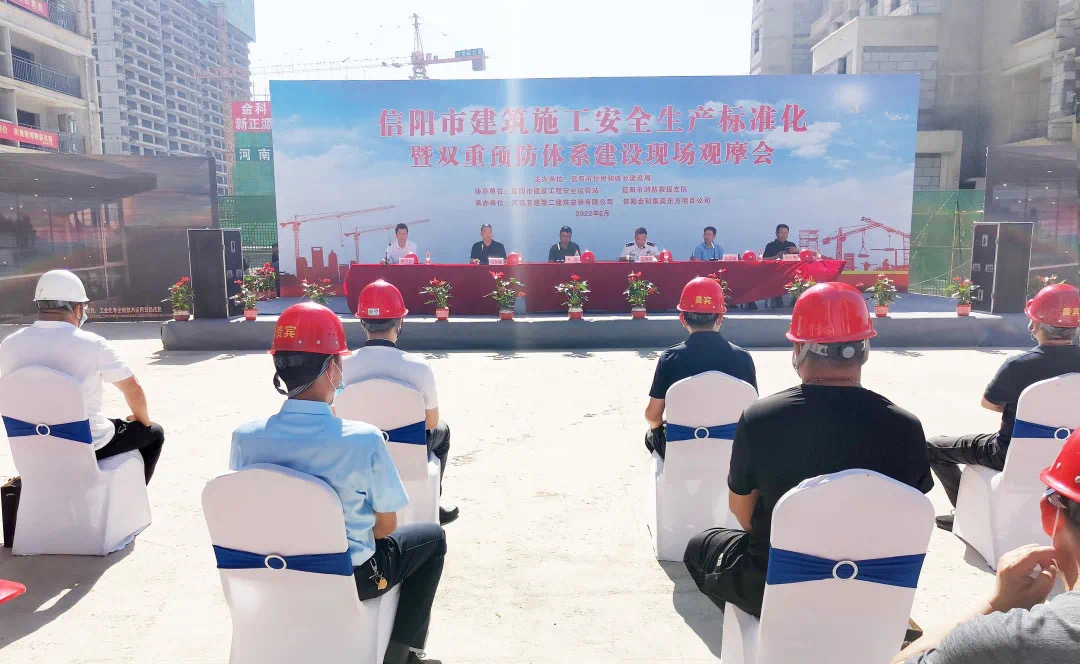 為深入開(kāi)展全國(guó)第21個(gè)“安全生產(chǎn)月”活動(dòng),提高工程施工安全標(biāo)準(zhǔn)化水平,推進(jìn)雙重預(yù)防體系建設(shè)工作,6月16日上午,信陽(yáng)市建筑工程安全生產(chǎn)標(biāo)準(zhǔn)化暨雙重預(yù)防體系現(xiàn)場(chǎng)觀摩會(huì)在我公司金科集美東方項(xiàng)目現(xiàn)場(chǎng)隆重舉行。市住建局黨組成員、總規(guī)劃師張立、市消防救援支隊(duì)副支隊(duì)長(zhǎng)王秀春、建管科科長(zhǎng)陳志國(guó)、安監(jiān)站站長(zhǎng)馬其峰及高新區(qū)住建局局長(zhǎng)張彥偉等領(lǐng)導(dǎo)參加活動(dòng)。公司黨委書(shū)記、董事長(zhǎng)、總經(jīng)理吳萬(wàn)仁受邀出席活動(dòng)并講話。整場(chǎng)活動(dòng)由會(huì)議階段、演練階段和觀摩階段三部分組成,由安監(jiān)站站長(zhǎng)馬其峰負(fù)責(zé)主持。